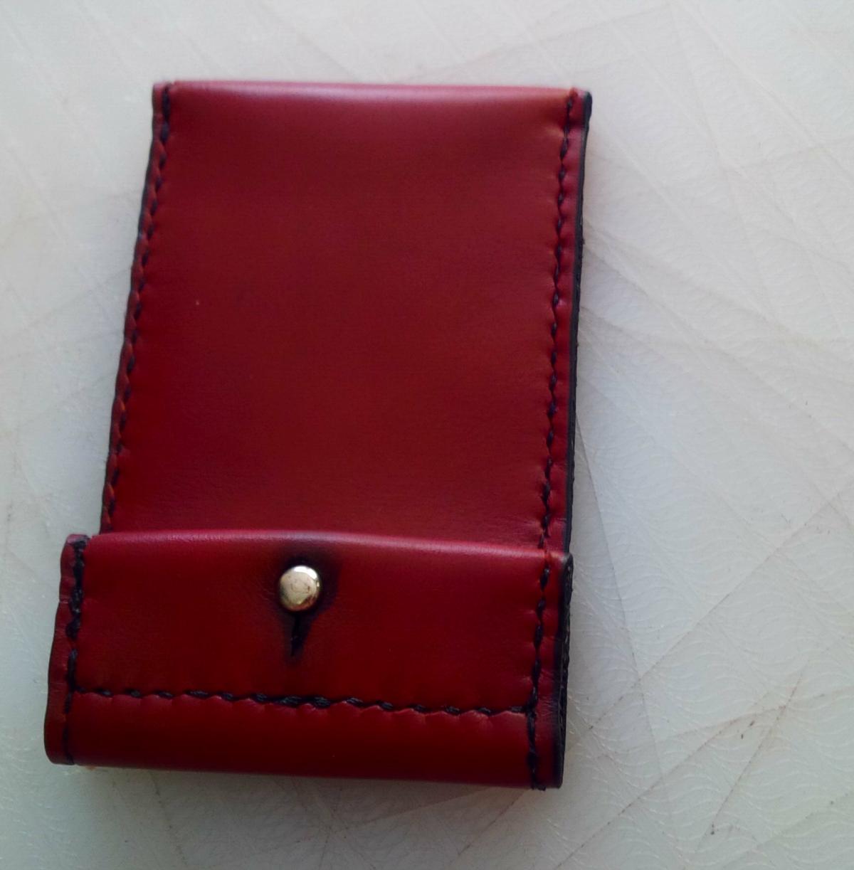 Mom says her business cards are getting ruined in her purse, so I made her this. It's about ready to polish and give to her. Leather- 3-4 Oz maroon calf. Lining: 1-2 Oz black garment. 7 spi with #69 black nylon thread, hand stitched twice. -JV474