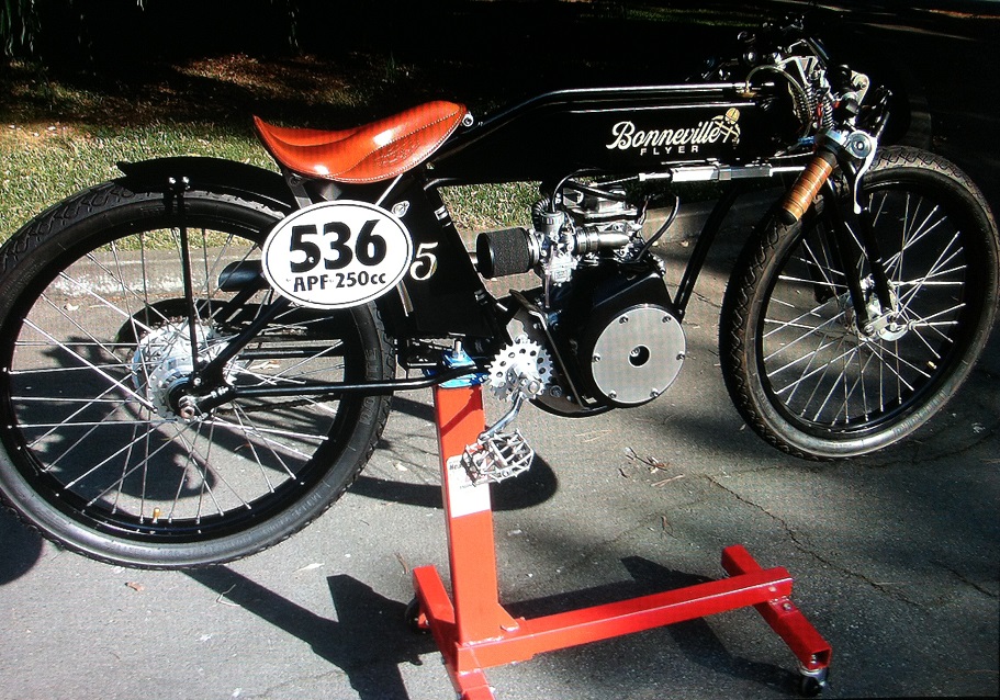 13. From what I was told, these are direct drive motorized bicycles. These have no transmissions to select gears from. So all you have is just one gear. To break the previous record, all he had to do is maintain a consistent speed of 79+ MPH. There is more involved than just going over the past record speed just once. Have to be able to run the track both ways as you may have a head wind assisting you in one direction and those speeds are averaged out. Then if you break a record speed , your vehicle is held at impound for tech inspection overnight. Then you need to run the following day and be able to back up your top speed again in order to go down in the record books. I was told by PAT that he was able to break the record and now is the new speed record holder in that class. Previous record was 78.048 mph and new record is 80.438 mph. It was an amazing story with a blown engine to repair on the salt lake while the clock was ticking between runs. He and his crew were somehow able to put together another racing motor from parts and get it inspected ready to run. Yet a great ending as he was able to bring home a trophy. Congrats Pat. I'm looking forward to the pictures from this event. Pat told me he has a nice photo of a Magazine Model sitting on my tooled seat. Will post photos soon. Chris
