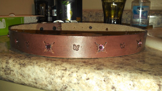 With her belt, I 'cannibalized the hardware from her HD belt. It was the fist experience I had with rivets and jewel inset.