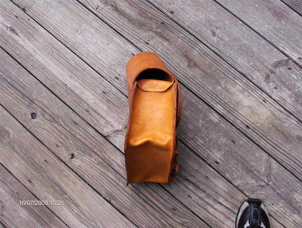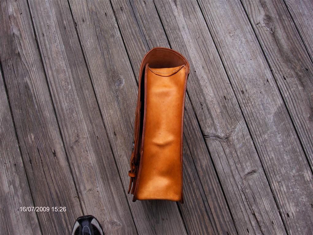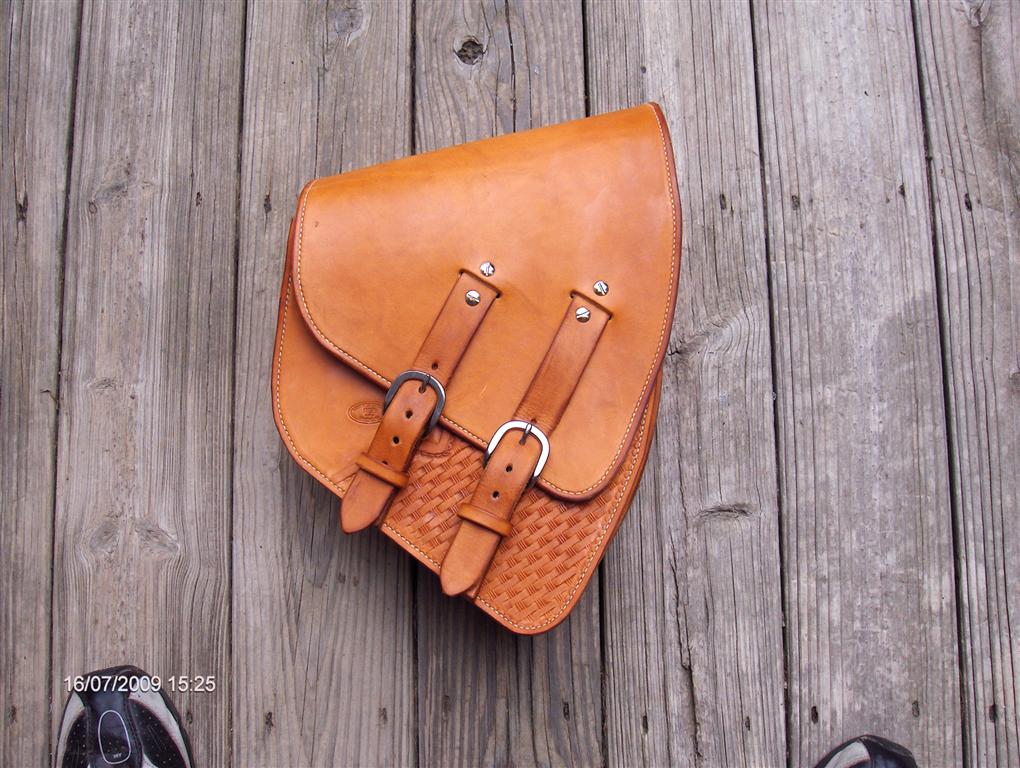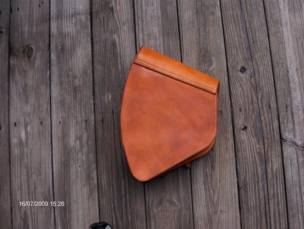 Had to make a quicky bag for a bro, today. Spent about 4-5 hrs, so far. I need the bike to figure out how to strap it on, so that parts not done. It's meant to actually strap to the swingarm, not the tin. But for a fast one, this turned out okay. Well, at least it will hold stuff for his trip. Front and back are 8-9 oz veg tan, sides are 4-5 oz ( collapsible was the operative word...maybe). Dyed with saddle tan mixed with Neatsfoot, and a quick brushover with walnut/neatsfoot. Sno Proof top coat. I wish I could of put more time into making it better, but he needs it... Thanx for looking... -Dave