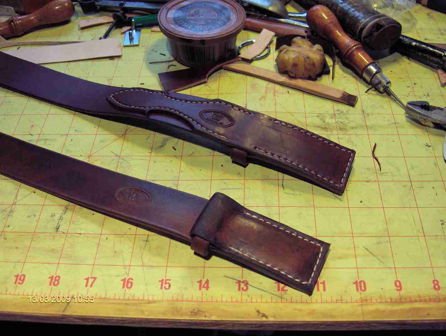 15. I've had a few people ask about these type of belts, so it's time to make up a batch. Here's the first two. I don't have a splitter, which makes it easy to make the simple kind. With the splitter, you just split back 4-5 inches, place the buckle plate, and keeper in, then sew it up. So I have to use a little creativity... The brown one is bullhide strap, with a calfskin top. Skive the strap tip down, place the buckle plate, fold over the calfskin, glue, and stitch. This one is Walnut oil dye, mixed with neatsfoot, covered with Sno Proof. The other is Chestnut Bridle, with Ranger style billet top. Handstitching would probably look better, and be able to sew tighter to the loop. It would also allow you to sew the loop in, in the more traditional style (ala Stohlman). But for production type, these look/work okay. For those who haven't made these, you can get the plate with either one or two tines. They also come in brass, if you can find them. I haven't so far. But a lot of makers have some metal shops make up what they want from brass and SS...that's a route, I may go. In general, I've seen these go for 16-20 dollars on the low end. 30-50 for slightly better quality ones, 70-80 from craftsman, and as high as 120 from nutcakes , I mean "designers"...lol I've dreamed up different versions for Bikers, Musicians, and Hunters. With a little salesmanship, I should be able to promote these outside of the mechanic crowd. Thanx fer lookin....As usual, feel free to show pix of yours, too