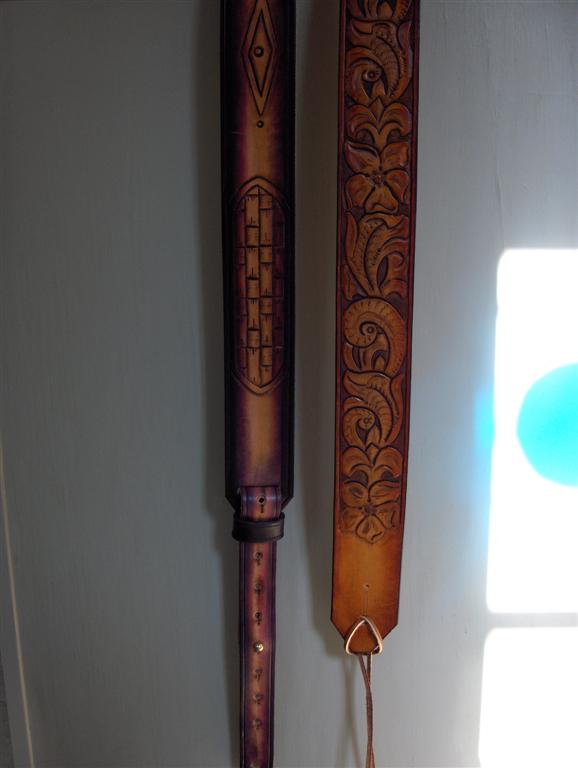 And people think these things are just gitar straps...sheesh You are absolutely right, there is a huge range in options. Not to mention specifically designed straps for mandolins, and banjos.... From a plain 2" strap with 2 holes and some latigo stips to exotic leathers and skins inlaid, backed, unbacked, lace, stictched, hardware, no hardware....the list goes on. Although Designs (carving, stamping, molding), and Shapes (straight, curved, ergonomic) can be limitless, I find the methods for adjustment are limited, and that frustrates me. One of the old books I have (c1800s) had a hook and eye made from heavy leather, that got my inventive juices going And then the customers come in with their ideas...... I look forward toward to your new pieces, they are inspirational...