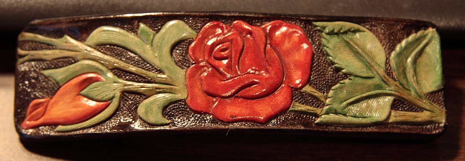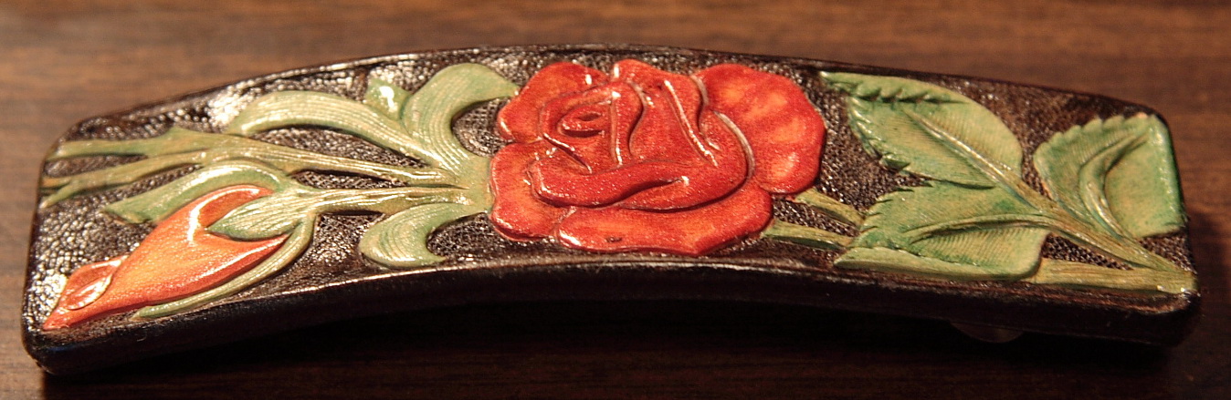 25. Thanks to all for the kind words! tjg: It's two layers. I riveted the clip (jewelry store blank) to the backing piece so the hair side is out. Then I tooled the top and contact cemented it to the back, thus covering the rivets. Then it's just trim & finish.