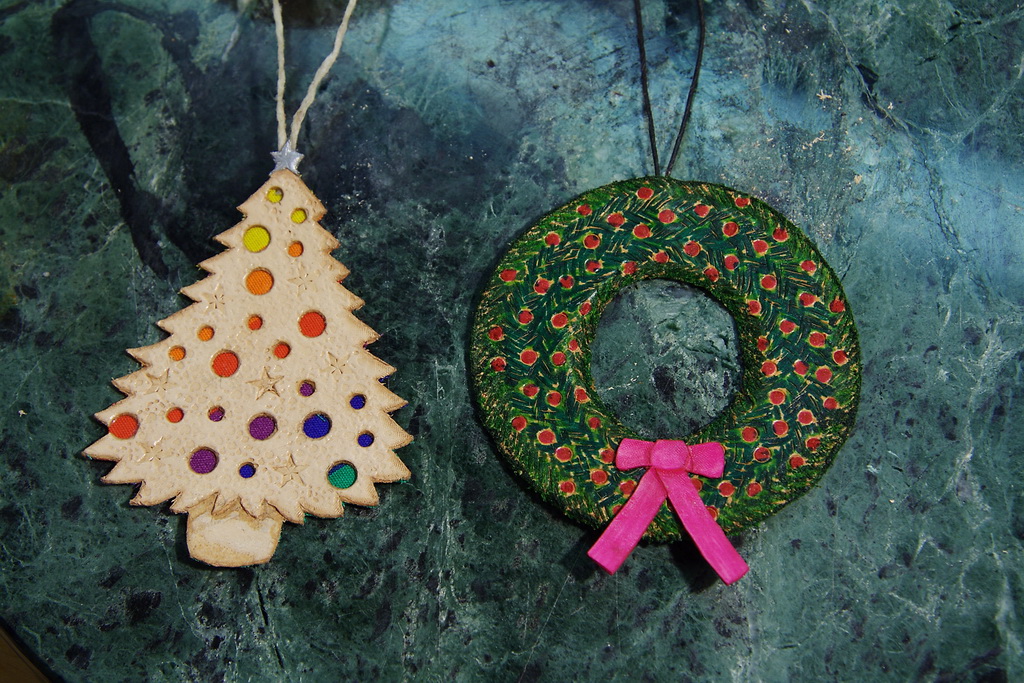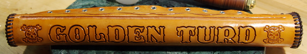 It's been a while since I posted anything. I aim to remedy that here and now! Prepare to be awed and amazed... A motorcycle crossbar (handlebars) cover. I made it a while ago, but just got it back so I could take pictures! Christmas ornaments. We made these at the Dec. guild meeting and were using various nefarious bits of scrap provied by our prez. The wreath was colored with sharpies, and turned out rather well. Then I got the tree home & made some "modifications" which you can see in the picture, but weren't there when I made it... Guild badge for Hoosier Leather Guild. If someone didn't want it to look like this, then they need to be specific! I had fun with this one. My Calumet badge is plain-jane and it's next on the hit parade. Here's a couple of post-carve and then a couple after dye & finish. Brent