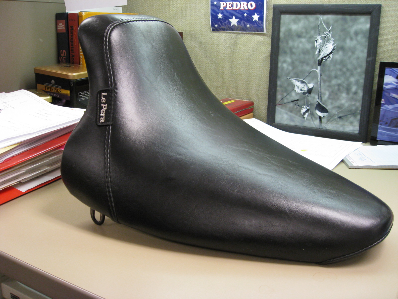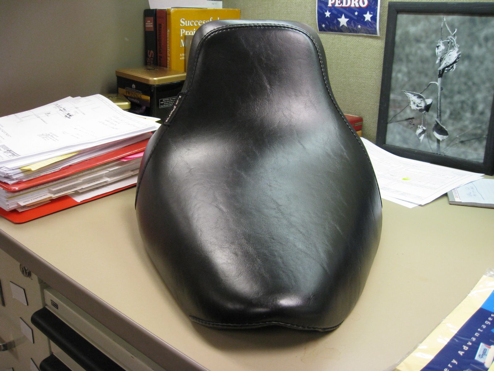 OK, so I have need to make a seat cover for a motorcycle. The wierd thing is I'm leaving the seat as it is, and just literally adding a covering to it. I made a handlebar cover for a dude at work and now he needs the seat covered to match. He doesn't want any tooling on the seat, but he did like the edge braiding. (How I managed to let that thing out of the house without taking a single picture I will never understand...) Seat is a LePara gel seat. I've attached a couple of pics. The color I will need to end up with is the Saddle Tan highlighter color stain from Tandy (Eco Flo type). What I need to know: 1. Should I cover it in veg-tan? I know I can dye it to match the handlebar cover at that point. I'm also fairly sure it can stretch to fit. 2. Is there a better solution? Latigo? upholstery leather? Can these be dyed? 3. If I end up with veg-tan, is there a technique to keep it from stretching all to heck after a while?j 4. Lastly, he doesn't want to disturb the original seat, so how am I going to attach it? help! thanks, Brent