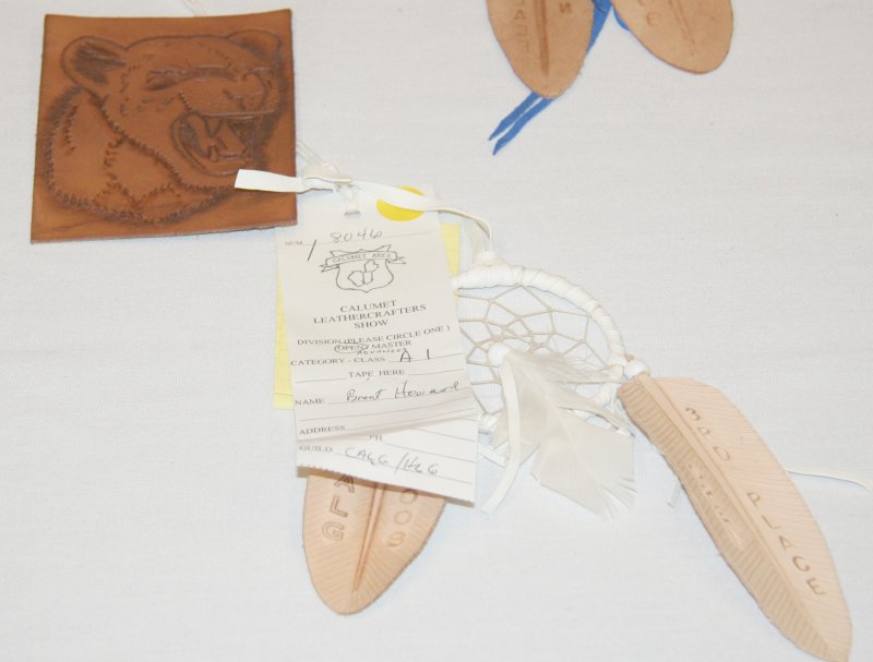 25. Johanna - thanks for making a page for these. I looked through yours on the home page and I don't think mine are any better. Next show, I want exclusive access after awards so I can get proper lighting set up. I was not happy with these at all. As far as the pretty lady with Allan, I'm not sure but will try to find out. Clay, right back atcha. Mine were: Mine is the bookmark on the right. It didn't place. My stuff on the HLG table: My checkbook cover didn't place at all! It was up against some very nice ones though, so I don't feel bad. Brent