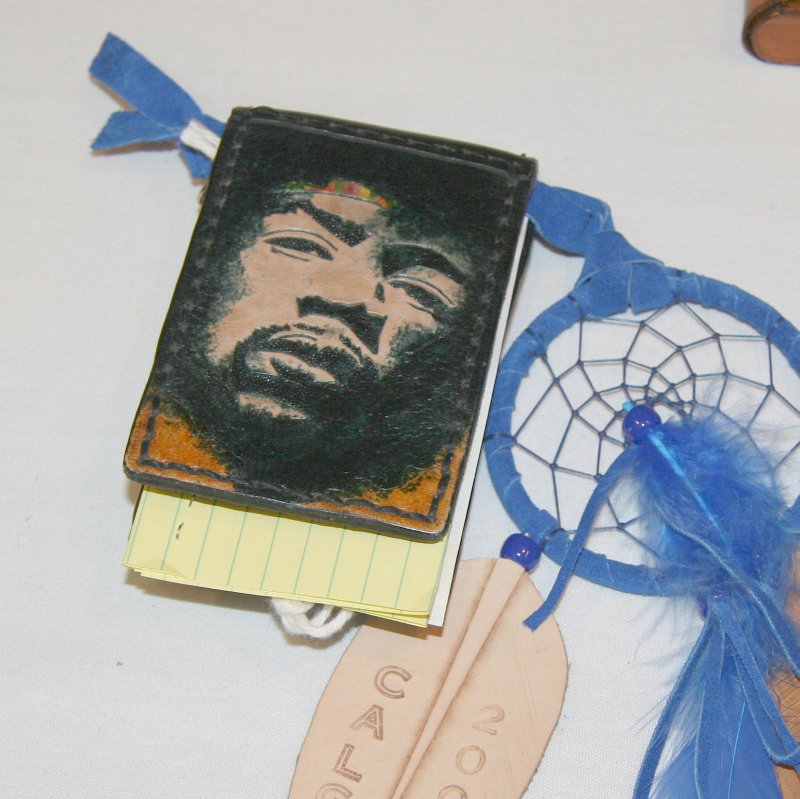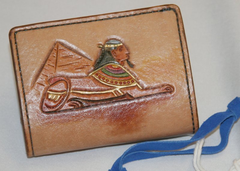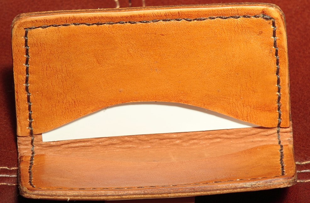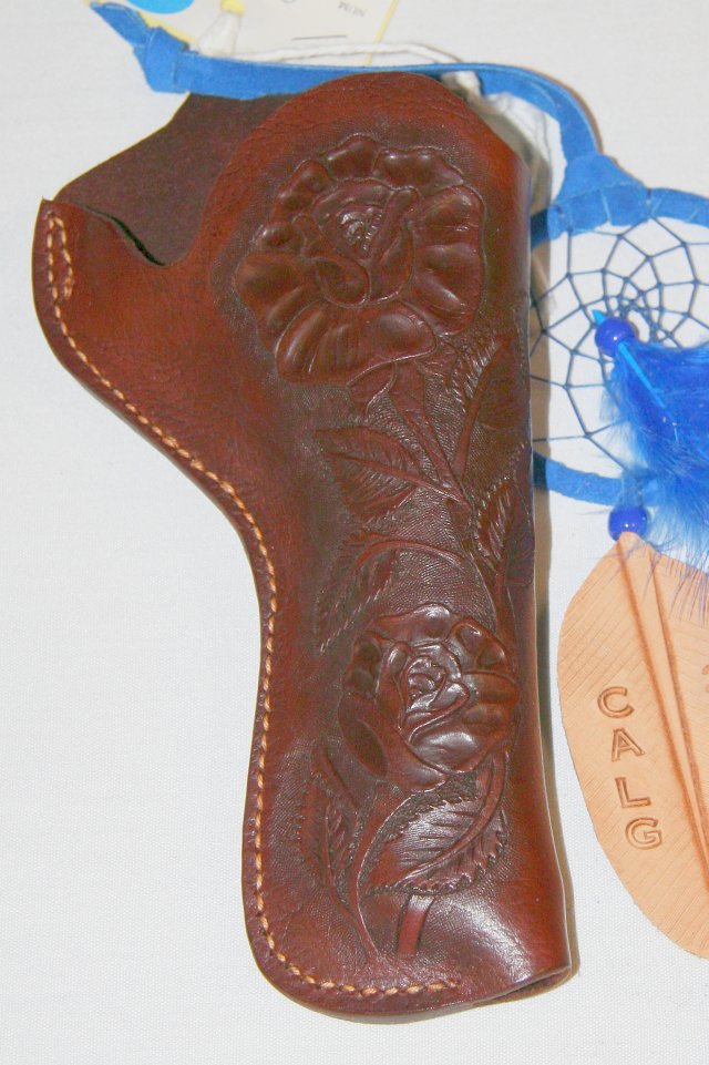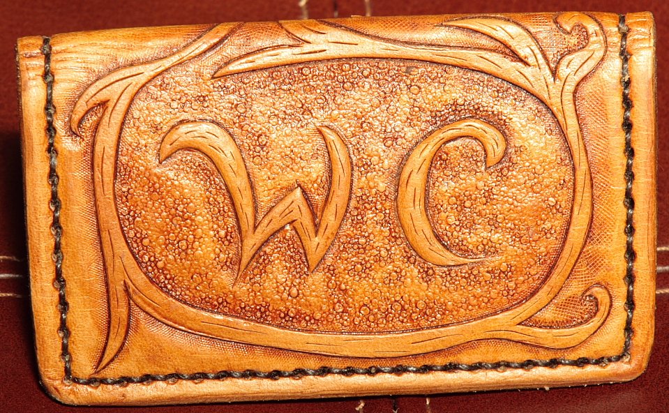 11. It started out life as a Tandy kit. I don't like their liners, so I made patterns from the kit for the lining and pockets. I went ahead and used the tooling leather from this kit, hence the holes. I have made one other so far (pictures later hopefully), but will probably end up making a bunch and giving them away. This one, in fact, is now a sample unit. The buddy I made it for (it turns out) is not "William" as his given name, but "Bill", so I have to make him a new one. Amazing how you can know someone for 40-odd years and never know a little detail like that. Anyway, I made the design by borrowing a rose from an old pattern and taking various leaves to fill in. Then I did the "vine" to wrap around the space for the initials. It's probably not botanically correct. You design guru's, any way to mod the design within the space? Brent