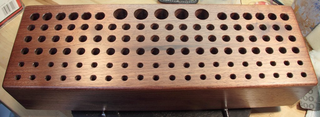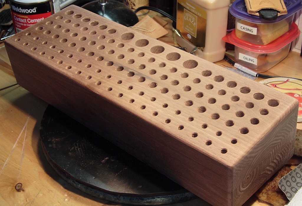 Not a new idea. Grandpa's Pastime sells these, as does Tandy and probably Hidecrafters & anyone else. I'm only sharing because a friend at work made it for me using my wood. It's black walnut... The wood was given to me by my best friend's brother, so it's got some history to it, especially from their family. It was his dad's & there's a whole sad story to it, and this is the first I've had a chance to use it. The only bummer is I didn't get to do the actual woodworking. I am doing the finishing though, but I'm sharing the raw wood pic first. It's flippin gorgeous. The grain is straight & dense. It was an old growth tree. Brent