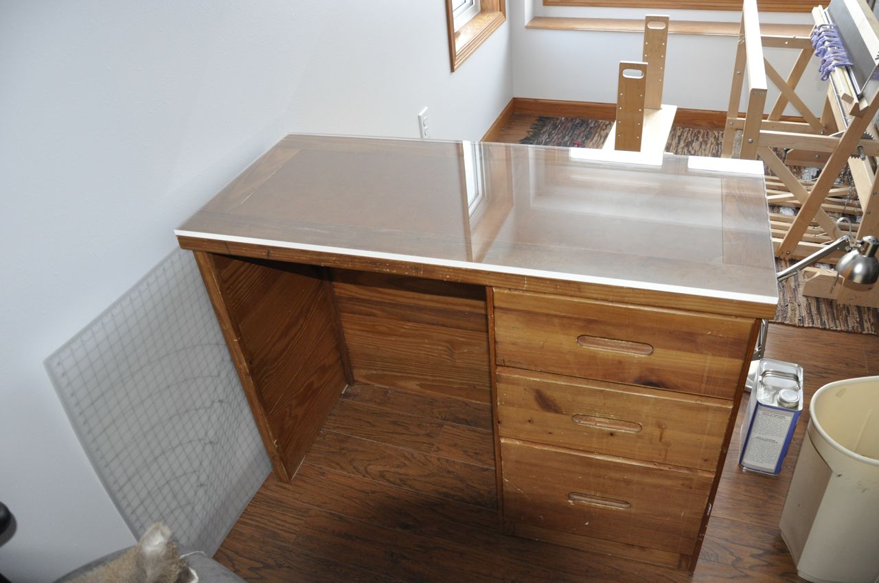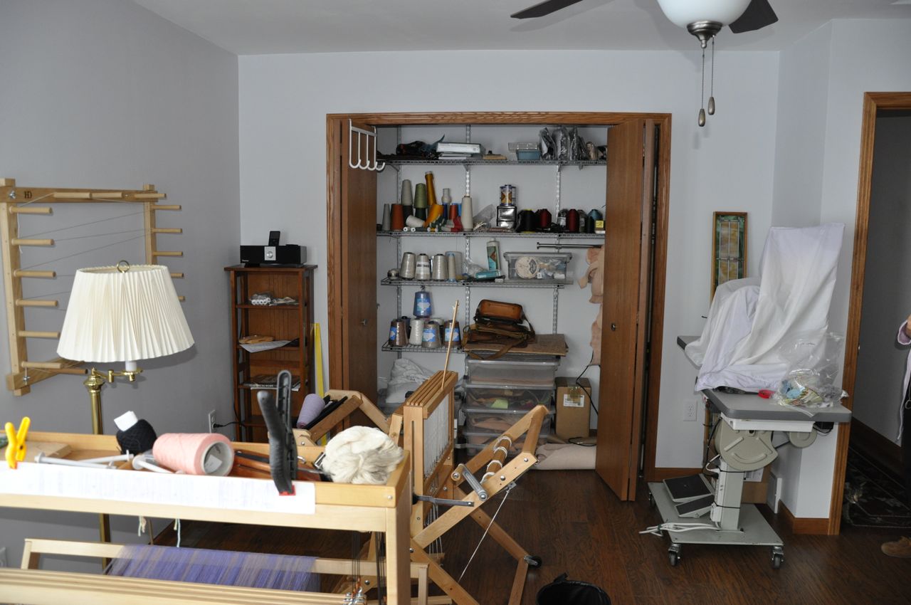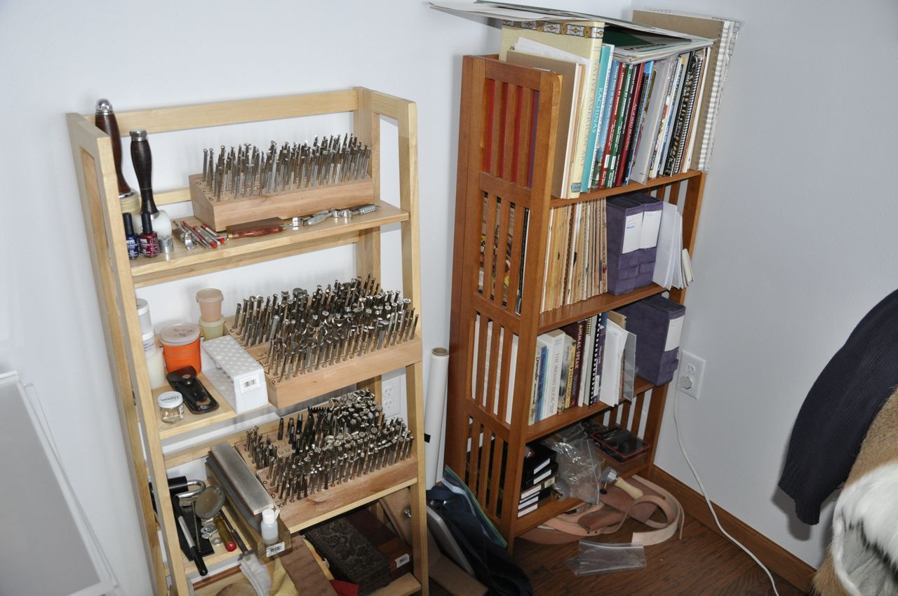 Here are pictures of the spare bedroom that my wife and I converted to our craft room. She does weaving and has two looms. The desk that I use was from Salvation Army for $25. The Plexiglass sheet for the top is from Professionalplastics.com and is 1/2" thick. Buy having it cover the whole surface of the desk, I get a nice work surface and it transmits all the force and noise to all the legs and to the floor. When I used pounding boards or rock smaller than the open space under the desk work area, it acted like the head of a drum and actually increased the noise. We took out the cloths hanging type shelving in the closet and replaced it with a modular storage system. Most of my bulk leather sides is hanging over the railing by the step leading to our lower level. I plan to build a hanging rack for the leather sides in the mechanical room for the house. I don't mind having my tools on the book case behind me and in the drawers of the desk since it gives my an open view out the windows of the room BillB