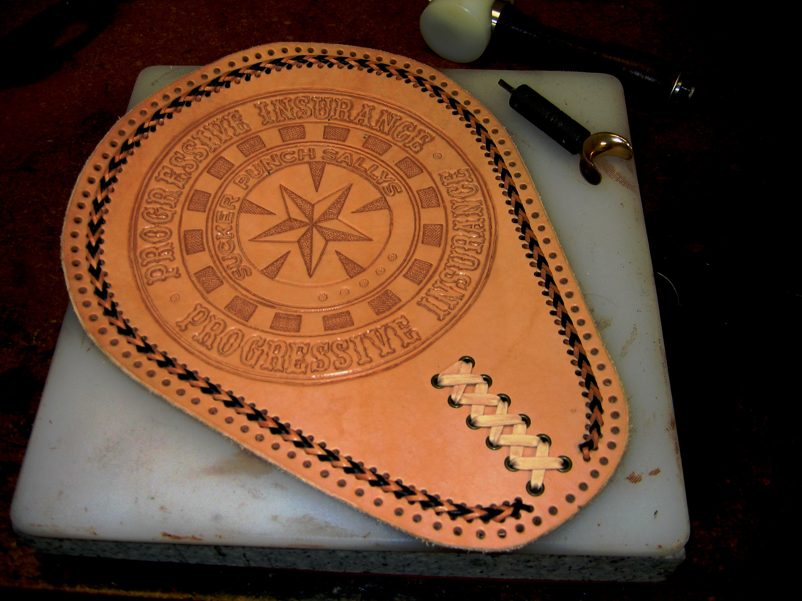 It sounds like you all could benefit from a trip to the eye doc. I have a pair of glasses with a prescription for computer work.... the same could be done for leather work. All you need to know is how far the workpiece is from your eyes. In the meantime, check out some of the lighted headband magnifiers at MicroMark http://www.ares-server.com/Ares/Ares.asp That should get you there.... If I messed up the link, go to www.MicroMark.com and type in magnifier in the search box. Dave Theobald