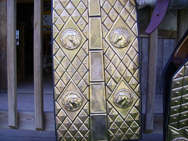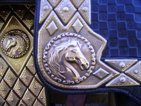 No makers marks on this one.All brass hardware.I'm guessing it's a Ted Flowers,but did he make brass ones?Do know this though,the monel and silver ones are a heck of a lot easier to polish up than this brass one was.Customer has this one for sale.Is complete with breast collar,bridle and britchen along with everything in photos.PM me for contact info if interested.