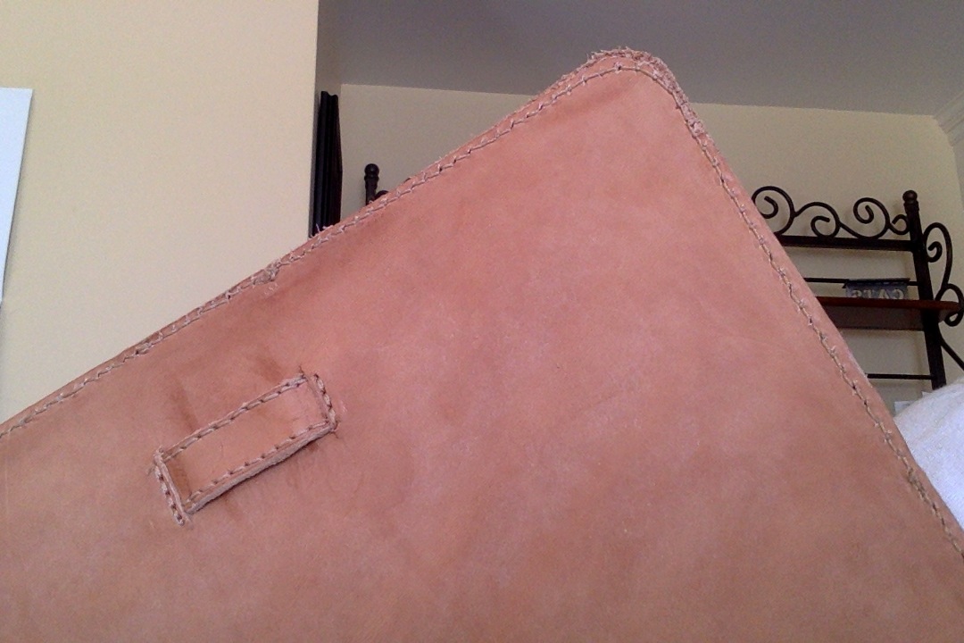 I have been making a journal/binder. As I was in a rush I ended up machine sewing the pieces together, however it has resulted in a lovely stitch on the interior (top side) of the piece and a stitch that somehow wanders close to the edge and appears uneven on the bottom for a section (the machine has some tension issues). I was using an industrial sewing machine but I'm not sure I had it properly set up for the leather I was using.