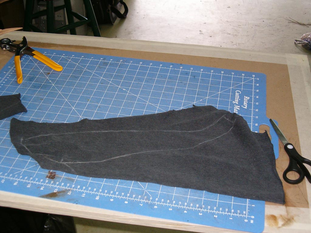Once I have the t-shirt secured to the seat pan, I use a grease pencil to mark a seam (or the edge of the pan).