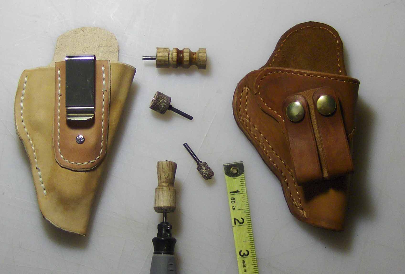 First, follow Katsass' lead, get the Weldwood contact cement and give that Tandy stuff to someone you don't really like. It stinks to high heaven, is a lousy product, and is far too costly. Second, . . . as far as I can see, you may have just quit too soon. It looked on my monitor as though the center line was indented, and the two outer layers were still rounded. I use a flat belt sander, . . . it's a $50 cheapie from Harbor Freight, . . . and I sand the edges until they are FLAT. But the other thing, . . . both holsters were looking good. Edges are something very few customers ever seem to care about. They want (in my experience): 1) fit, 2) function, 3) color, 4) decoration or esthetics, . . . and somewhere farther down the line, . . . a seasoned old timer may run his thumb up or down an edge or a seam. Now that is no excuse for poor workmanship, . . . but it puts the whole thing in it's proper perspective. May God bless, Dwight -