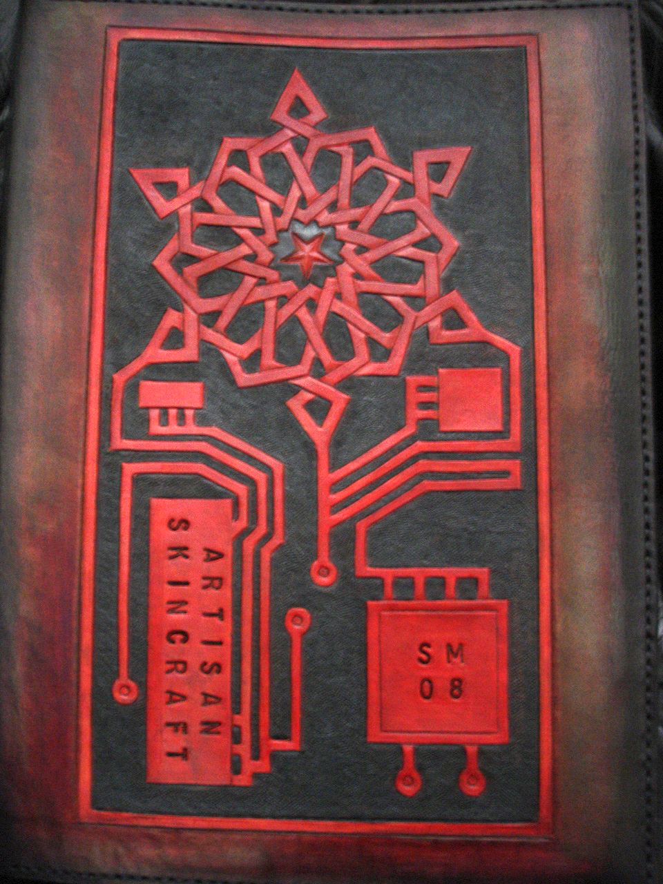 I've had a couple of requests for leather journals, so I thought I might make my maiden voyage with my own. Better to make all the mistakes on mine before putting a pricetag on it. The journal is intended for meetings at work, where as a telecom project manager, I spend my days herding geeks. I wanted to mix a bit of my love for knotwork with a bit of circuitry and here's the result, front and back. Let me know whatcha think: good, bad, constructive, destructive, etc!