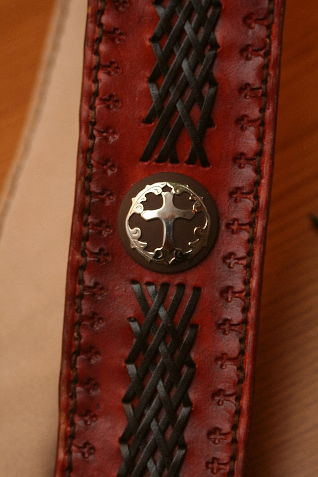 Ok. Critique all you want, but after all the work I put into this, I don't think I'm gonna "improve" it any....it goes as it is. (Of course, I'll take all criticisms gratefully...I'll just save 'em for "next time") My first try at this, and it was more work than I thought it'd be...or more than I'm getting "paid" for...the "customer" is an old friend in a Christian band and, (only because he's an old friend), he's swapping me a bird house he built for me. He wanted a non-adjustable, 45" strap. I put padding in it, and braided a 5-strand applique, and added cross conchos...stamped small crosses along the stich line.