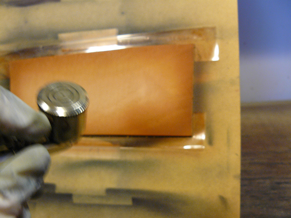 Marlon asked earlier about techniques for shading edges with an airbrush. Here's a quick series of photos I put together to show how to do that. It's also quite easy to do, even for someone without a lot of airbrushing experience. (Sorry about the quality of the photos - I was too lazy to set up the tripod to do this series, and was holding the camera in one hand while I worked with the other. Bad idea - won't do it again. Anyway...) I just used a piece of badly abused scrap for this demo. To begin, I'm putting a thin line of color around the very edge of the part. This can be done for one or more passes, depending upon how dark you want the shading. Then, start spraying a gradually wider pattern... ...and wider. The color will be darkest around the edges, and gradually and smoothly fade towards the center. If you want a little more darkness around the edges, to give it almost a burnt or even charred appearance, add a thin line around the edges of your color with something darker mixed in. I mixed a few drops of black dye in with my tan. Finished. If you use antique, make it darker. Kate
