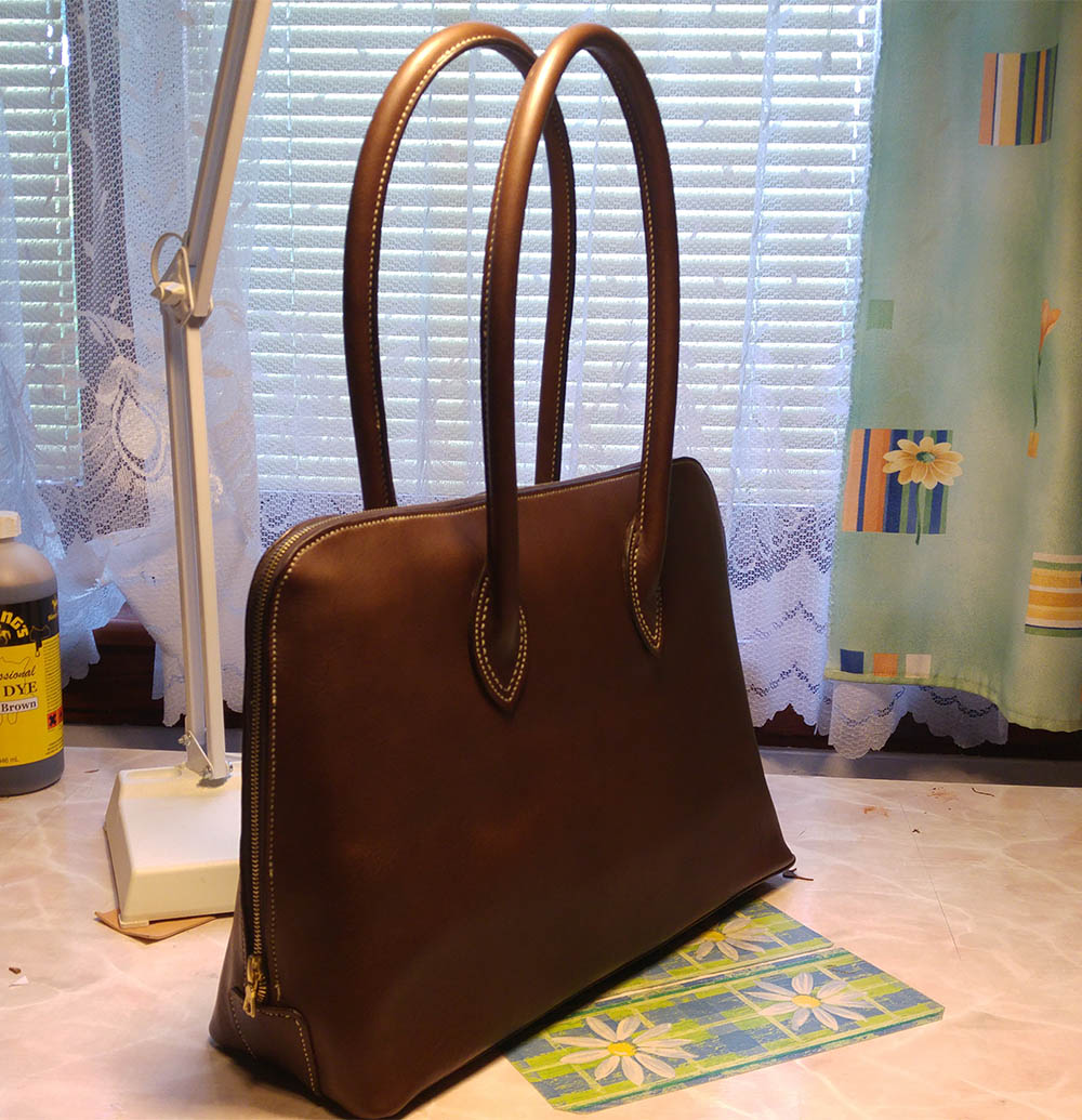 Hey there! I just finished my 2nd bag (1st one was a very simple turned messenger bag) which took me over a month to finish (in hobby time of course). Unfortunately I failed to anticipate how heavy the bag would be before deciding to go with all leather interior. It weighs around 4 pounds but that is mainly because the thinnest leather for the interior i could find was 1.1-1.2mm. The exterior is italian veg. tan leather and completely hand sewn but the interior is from chrome tanned leateher and is partially machine sown. It was also my first experience with machine sewing and adding zippers in general. Please feel free to write your opinion on the bag and point out possible improvements.