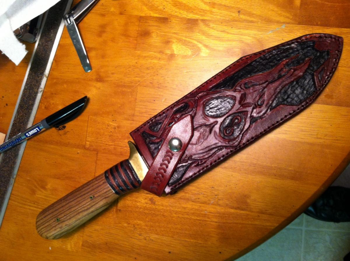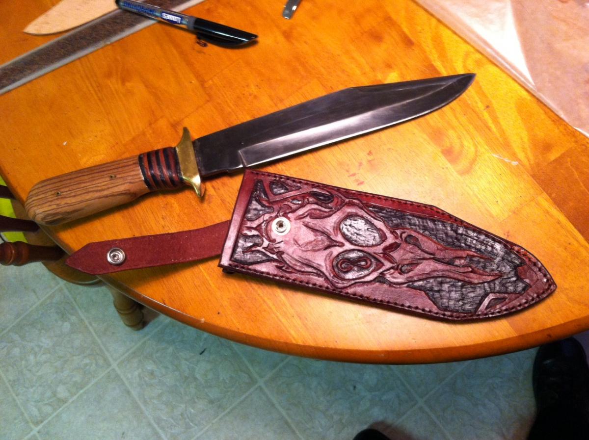 Thanks! It's a Tramontina bowie blade that my father bought from a flea market when I was too young to remember...that puts it at over 30 years old. It's a 9.5" high carbon blade (specifics unknown). I re-blued the blade and replaced the handle that he had on it with zebra wood, mosaic pins, and stacked leather as a spacer. I figured with all that work, it needed a slightly nicer sheath!