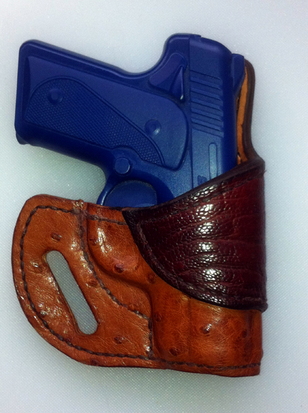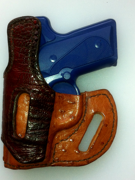 I made this for my brother. Kimber Solo. It is my first ever modern holster. It is covered in cognac Ostrich with a burgundy/brown Ostrich Leg reinforcement piece. I shipped it to him in a cigar box I bought at a flea market ($2) solid Spanish Cedar If you can see it I added an extra stitch line closer to the trigger guard. I hand molded it, then used a vacuum clothing bag to vacuum mold it as I used a bone creaser to work the leather tighter into the bluegun. Anyone work with Ostrich? Any suggestions to remove fur from back. I used a tabletop belt sander with shop vac to remove the fur. Also, when I started to dye the edge of the reinforcement piece, the dye soaked into the ostrich leg. Any suggestions to prevent that from happening?