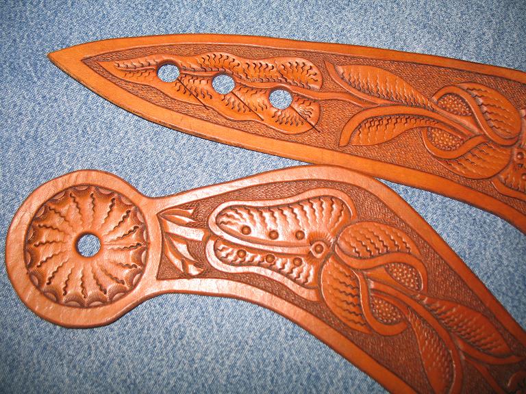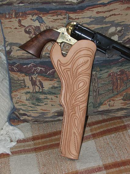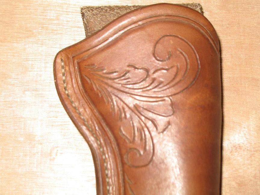 howdy guys and gals just wanted to post the pics of a 1911 45 auto western style hoslter that was done in a homwmade walnut dye and i didnt wanna go fancy so i just did some deco scroll cuts and called it good enjoy Cowboy316