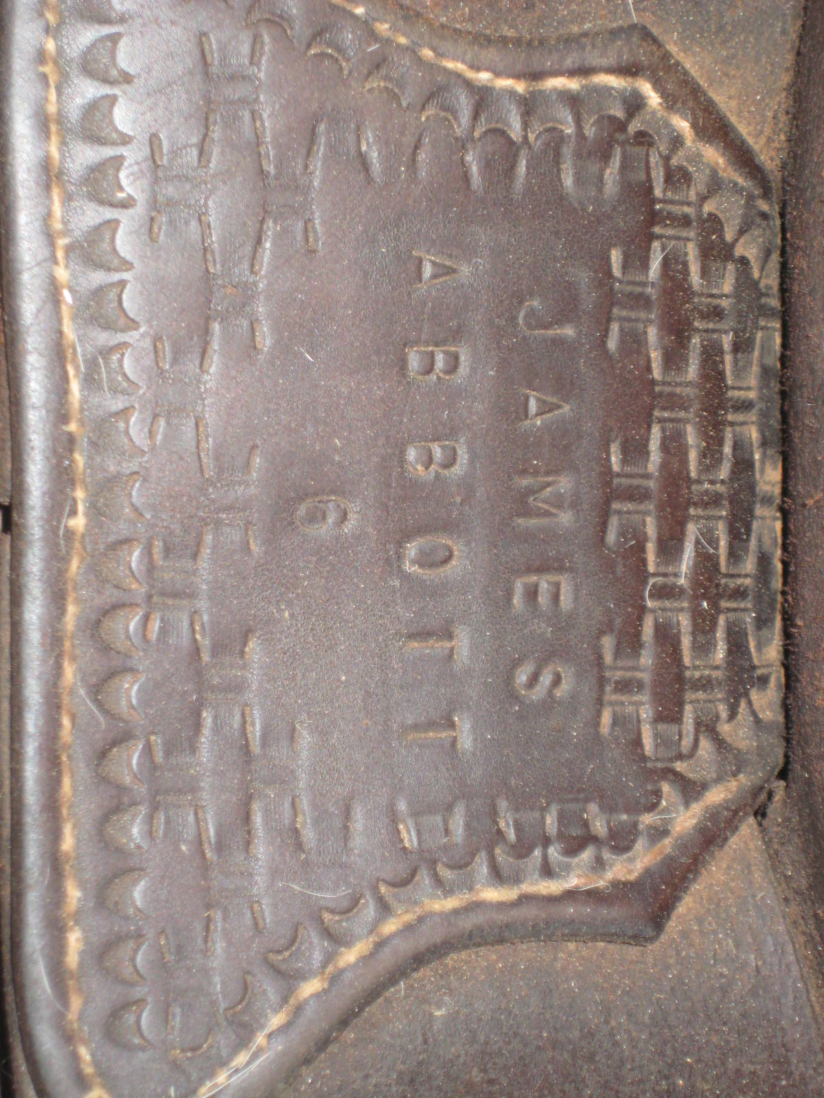 Sorry it's takin me so long to get these on here, I couldn't figure out how to post the pictures, hopefully I have it right this time. I found a brand on the saddle when I went back to take the pictures. I included it in the photos. It is an x with a bar on top, might be a clue to where it has been. My friend said that he bought it from a man here in Oklahoma but has no clue where that man got it. I have searched in several places but have yet to come up with anything on James Abbott but I am going to look up the brand to see if that gives me any clues. I am doing research on the saddle in trade for shooting lessons. So far I seem to shoot better than I research, so any help will be appreciated. Sorry again for the delay in responding. Thanks so much!