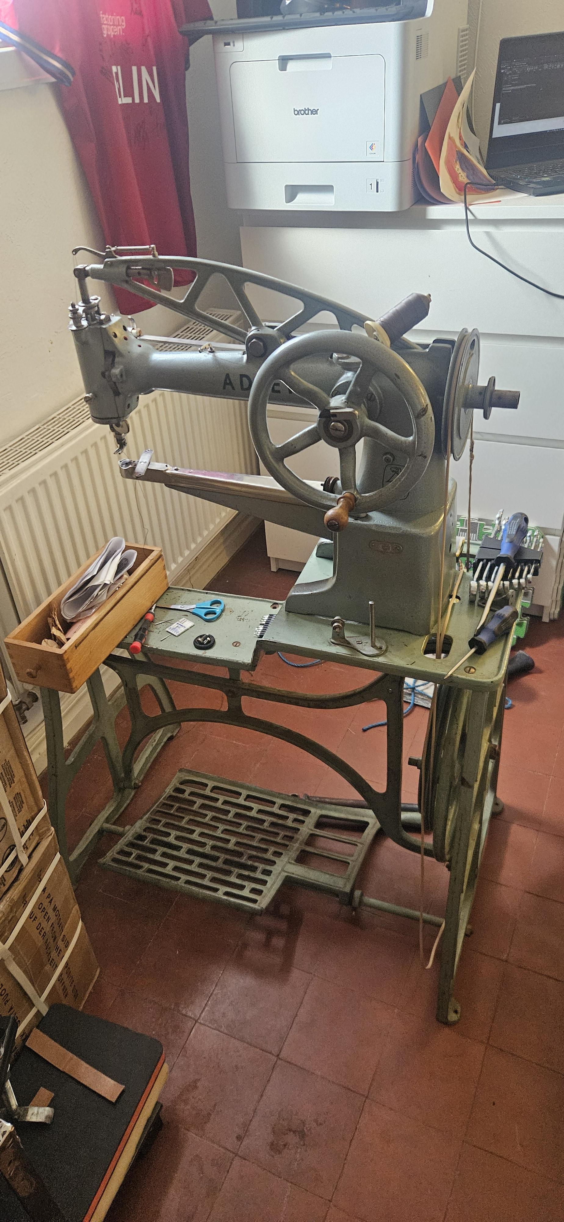 Cowboy CB4500, Singer 107w3, Singer 139w109, Singer 168G101, Singer 29k71, Singer 31-15, Singer 111w103, Singer 211G156, Adler 30-7 on power stand, Fortuna power skiver and a Pfaff 4 thread 2 needle serger.