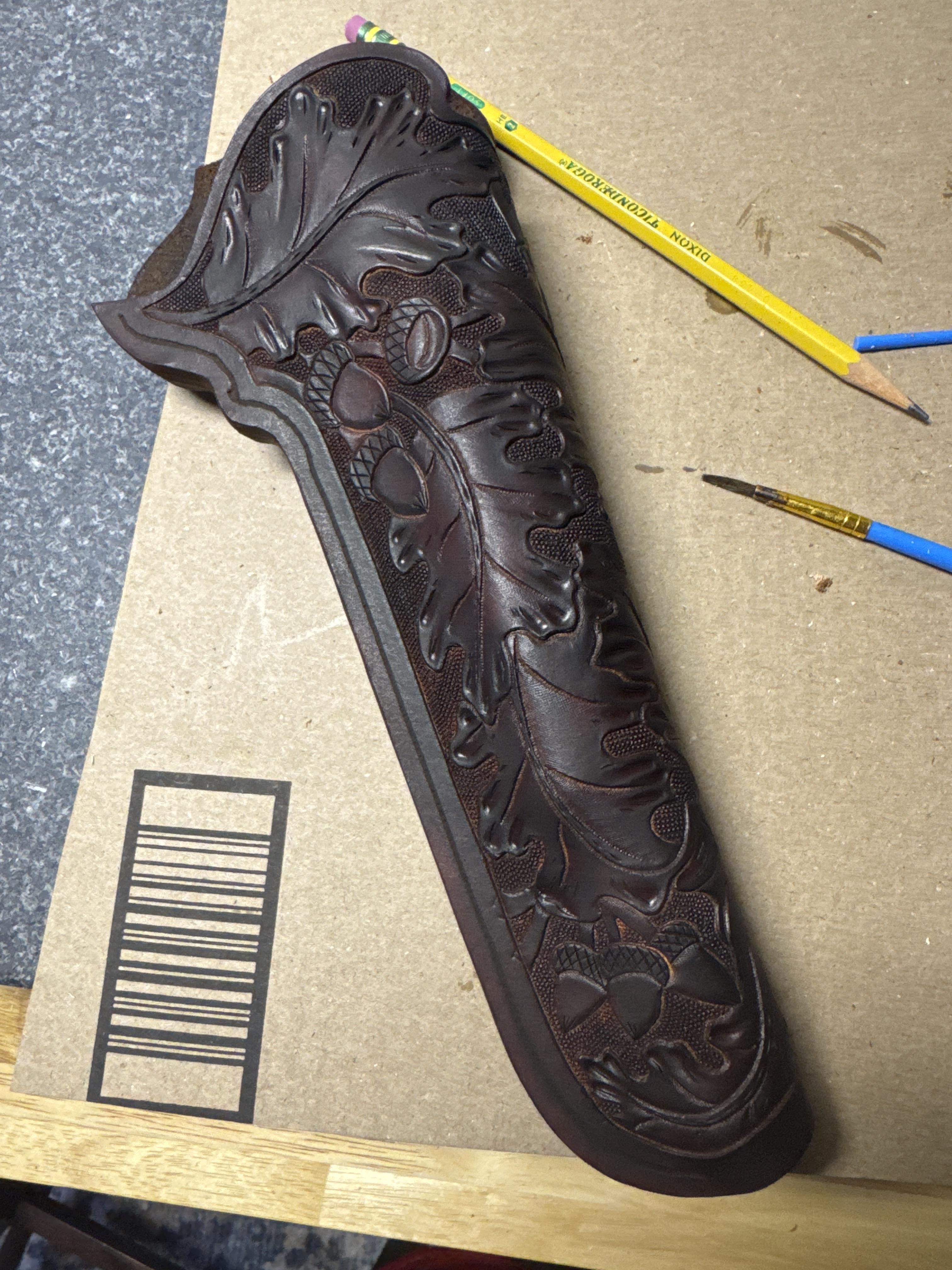 Members Swilly Posted 3 hours ago Members Report Posted 3 hours ago Good morning everyone. I’m new to everything leather and have a holster nearing completion. I’m not sure if I have the order of operations down yet, and would love some input. So far I have…. Did all the tooling Dyed Glued Wet formed Sanded edges Burnished edges with water Sanded edges with 600 Dyed edges Light coat of neatsfoot oil From here, I plan on burnishing edges with gum trag, applying resist and antique, resolene, then a couple rivets and stitching. Should I use gum trag on flesh side, or just resolene? Seems like it’ll be difficult to get the interior completely coated with anything. Should I have coated the flesh side with something before gluing? I was afraid any coating would keep me from being able to wet form. This holster is unlined, but I’m considering this one just practice and next one will be lined with some 2oz veg tan goatskin. Thanks for any advice. Quote