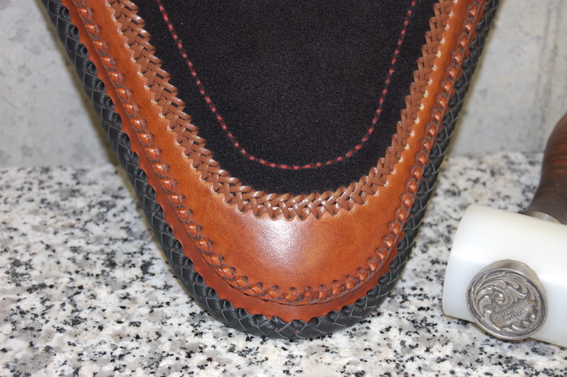 David Posted July 3, 2009 Report Posted July 3, 2009 This seat was a challenge because of very little guidance from the customer. My instructions were No Tooling Brown seat Wants dark red contrasting stitching. That is pretty vague to say the least. I tried every shade of brown with the red stitching and it looked really bad. The red would just disappear on brown leather. It looked great on black however. So I made a seat that I had only done twice before. I used a suede insert and lots of lacing then added the red stitching to the black suede. The result is a pretty classy looking seat, in my opinion. Let me know what you think. This customer found me on my website and as it turned out, he lives less than three miles from me. David Theobald Quote