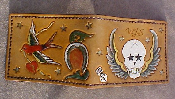 Members CarvedOn Posted December 8, 2009 Author Members Report Posted December 8, 2009 (edited) Very nice. Love the color. Did you use tattoo flash or freehand them? I freehanded them on a piece of paper and then traced them onto the damp leather. On that skull I drew one side and used that side to draw the other side to keep both sides even and fairly close to each other in size and shape. Edited December 8, 2009 by CarvedOn Quote