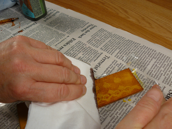 Members CitizenKate Posted May 1, 2008 Members Report Posted May 1, 2008 I've seen a few people ask how to dye your projects so the tooled impressions are lighter than the un-tooled areas. Most projects are dyed/antiqued in such a way that the impressions are usually darker than the rest of the leather, but making it the other way around can also be very attractive, as most of you have noticed with the work of Sojourner Leather among others. I found a pretty easy way to do it, so I'm posting a quick little demo to show you at least one way to do it. To start with, I have a piece of scrap with some tooling on it. I'm putting a wash of pure yellow dye on it as a kind of under-coat of color that does penetrate into the depressions. You can use other light colors, such as light tan, or just leave it natural if you prefer. To apply the "top" coat of color, I often use a block of wood, MDF, or anything with a kind of a blocky shape that has a nice straight edge on at least one side. In this case, I found a piece of plexiglas I had laying around. (DO NOT use plexiglas with spirit-based dyes.) Then I take a soft cotton painters rag, or piece of old tee shirt, and wrap it snugly around the edge of the block I want to apply the dye with. Notice here how I am holding the block applicator over the project as I am drizzling dye on it? Well, that's a very good example of what NOT to do! (Just wasn't really watching what I was doing, but fortunately, the drop that fell went onto the newspaper. - whew!) Anyway, just lightly soak the rag with dye. You don't want it to be totally saturated, but there needs to be enough to give you solid color. This was not a particularly good piece of leather, so I really had to work to get some color into it. But the idea is to wipe the edge of your block evenly over the surface of the leather, applying dye to the high parts, and leaving the impressions more or less untouched. And here is the result. It looks a little grainy because of the poor quality of the leather, but this should give you a pretty good idea how the process works. Kate Quote