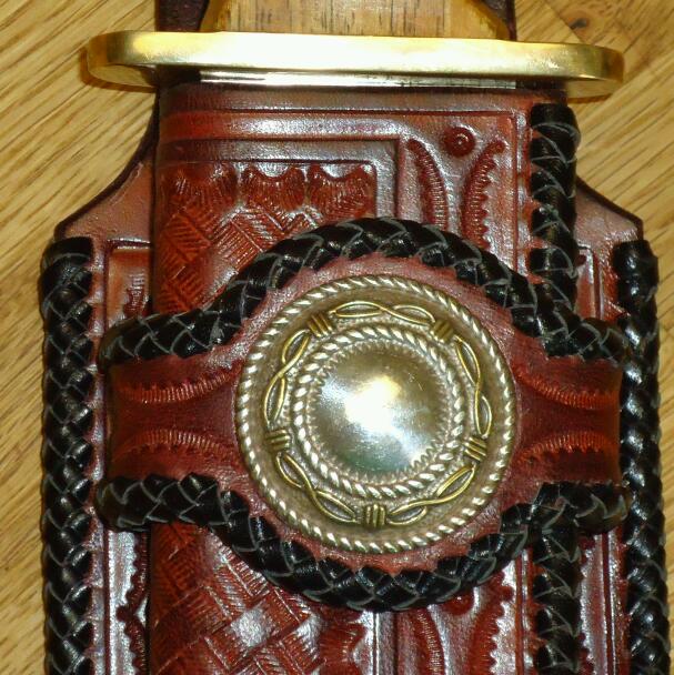 Members PutnamLeather Posted April 30, 2012 Members Report Posted April 30, 2012 (edited) This cowboy action style knife sheath with skirt is designed for a bowie style knife with a blade measurement of 8x2". The sheath itself measures a total of 13x4" all edges are adorned with 20 yards of black lace in mexican round braid, fully hand tooled and decorated on 9oz leather with silver and brass colored conchoes and brass hardware. Edited April 30, 2012 by PutnamLeather Quote