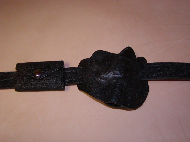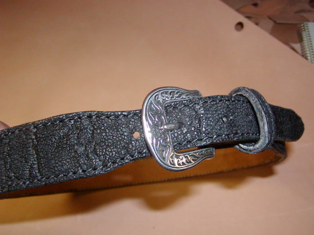 I proposed to use his hide as an overlay on cowhide to produce his order. He liked the idea and sent me a large section of hide with an order for 3 holsters, 3 pouches, and 3 belts.
