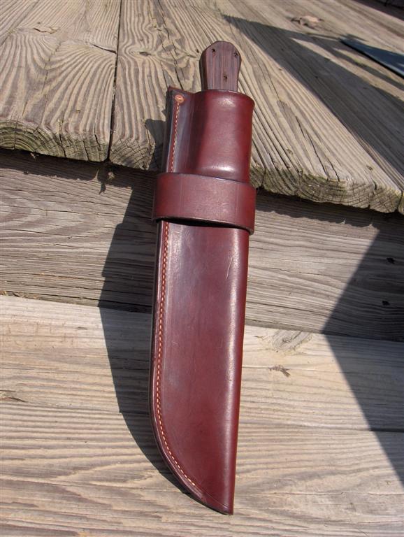 Contributing Member rdb Posted September 23, 2008 Contributing Member Report Posted September 23, 2008 A customer referred to me, asked for a sheath for this bowie, given to him from a friend visiting up from Down Under. The knife reads: Rowland Swinden Sheffield Start to finish about 3 hrs. Chestnut Bridle Leather. Machine stitched, except for the loop, , Copper Rivets, Zack Whites edge ink (I have to touch the edges up, I reworked things after it was done, and kind of roughed it up in some areas...Note to self...leave things alone when your done), rough molding job. It's maybe a $45 sheath not a $200 one, but it looks nice to me. The knife locks in good, with the feel of a click. The loop is not riveted to the sheath, it moves. If you pull it up it tightens around the hilt...good for traveling in rough woods, or so my premise goes. Anywho, thanks for looking. Quote Web page Facebook
