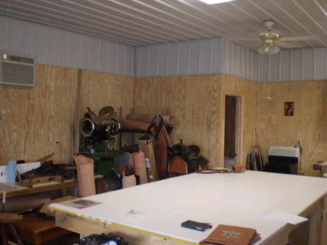 In the back ground is an old drafters table that fell off the back of a truck. This table has a drawer the depth of the entire table. It is in this drawer that I store items that are in the process of being assembled to keep them clean and avoid them getting knocked about. At the back of the table I have plastic maxi bins for buckles etc and on top of these there is a shelf that has holes for storing small hand tools I don't use all the time. Against the wall I have various patterns and next to this I have tools on peg board that don't fit on the benches elsewhere ( wrenches, mallets etc)