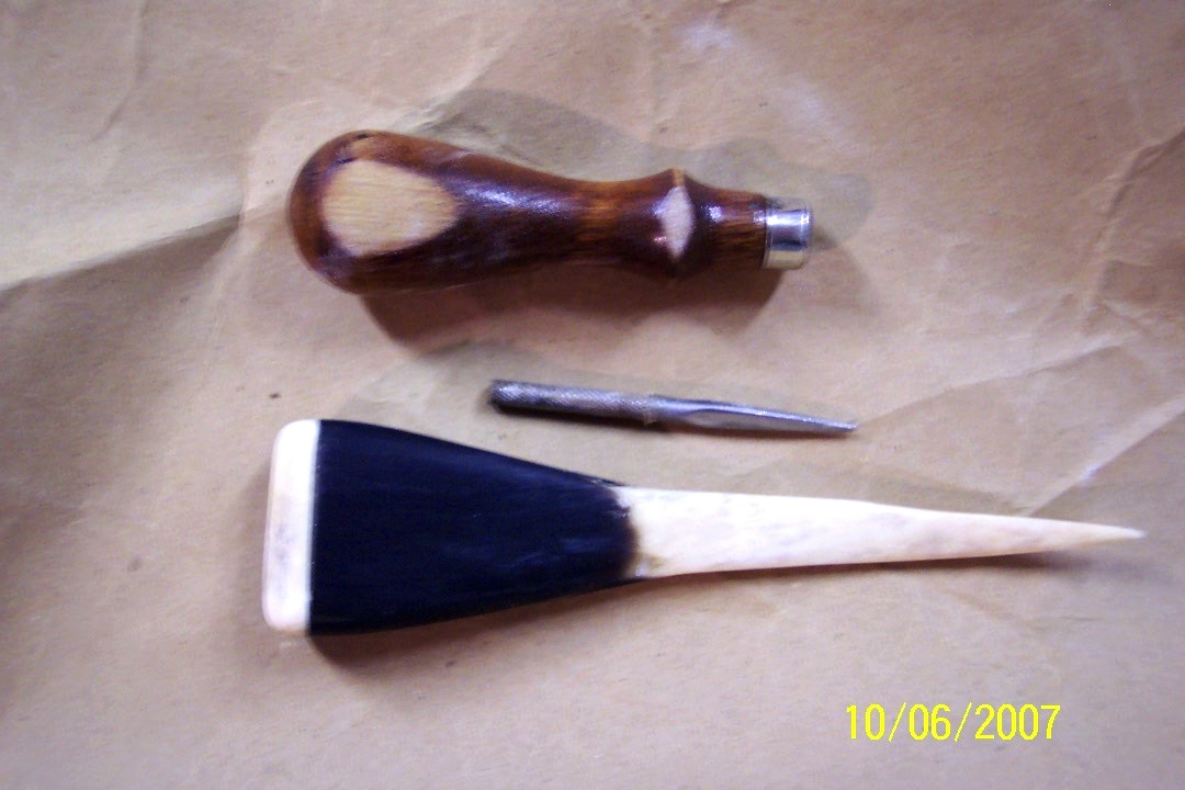 Members Mike Phelps Posted October 6, 2007 Members Report Posted October 6, 2007 My old lacing fid kept falling apart, didn't fit my hand, too short and prone to roll off the bench etc. While cutting up some bone for guitar bridges, nuts and saddles I had one long slender tapered piece left when the lights came on. Now, I said to myself, I can make a "Real Fid". So I picked up some left over pieces of horn and more lights came on. I put the glue pot on the burner and got busy with the hack saw and sanding blocks. I really like the way it has turned out so far[i'm prone to keep working on stuff forever when I make it for myself]. The bone appears to just be growing out the horn handle slabs. No "hardware" was used just bone, horn and hide glue. Only tools used to make it were a hacksaw, sand paper and homemade sanding blocks and sticks, a vice and spring clamps. Oh and some imagination. Required about a total of six hours labor on my part not counting the time for the glue to set. What I really like is how it all ties together in the greater scheme of things. Hide, bone and horn. Quote Freedom grows where gamcock crows